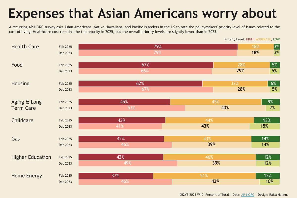 This week’s challenge draws from a survey conducted during Asian Americans, Native Hawaiians, and Pacific Islanders (AANHPI) Heritage Month, where respondents rated how much of a policy priority certain cost-of-living topics are, such as healthcare, housing, food, gas, and childcare. The data includes: